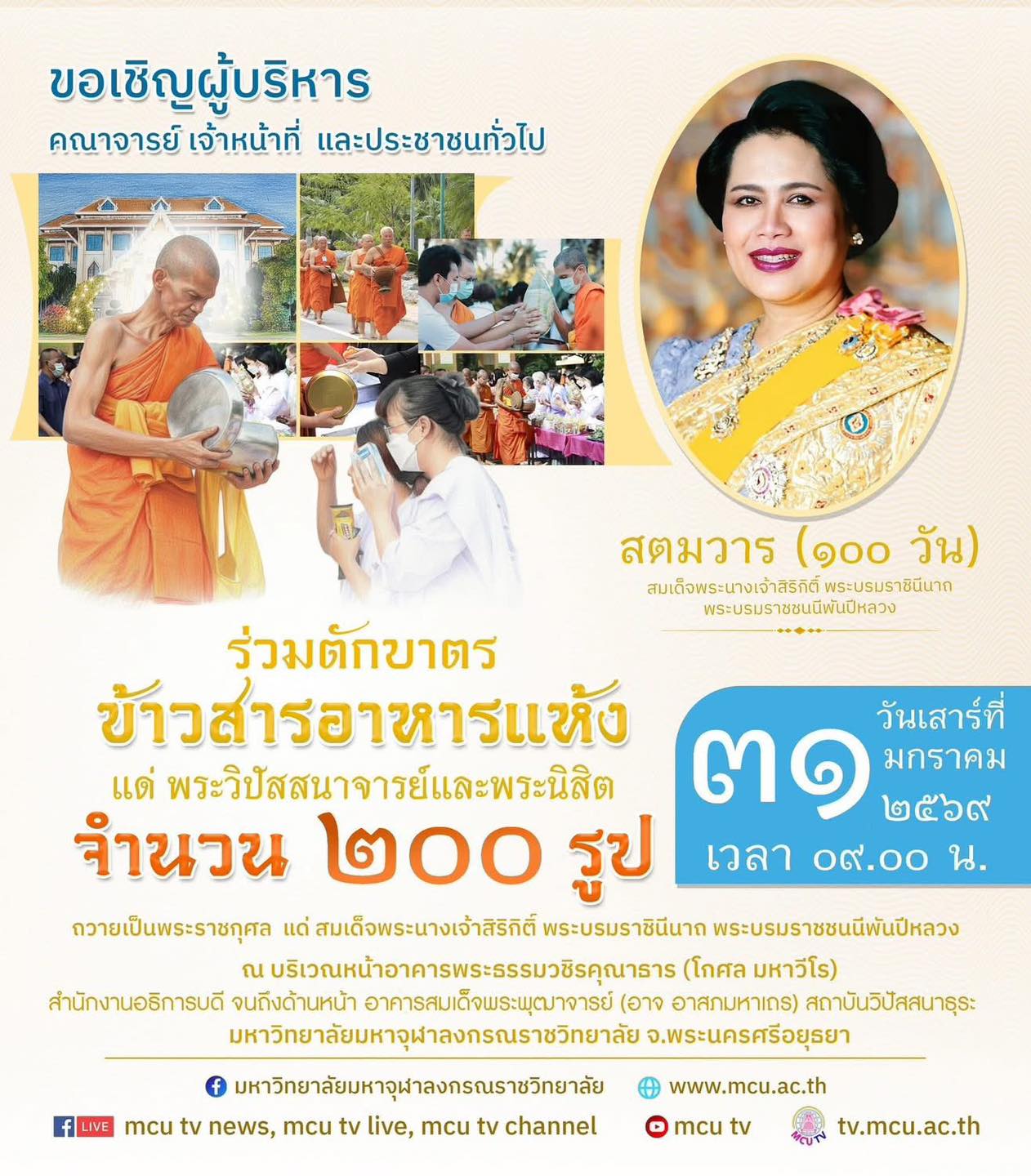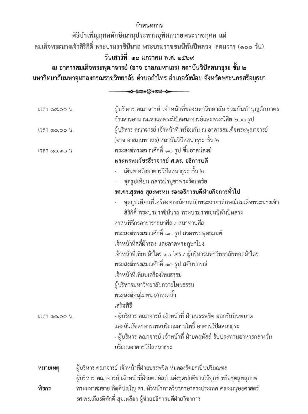 สำนักงานสภามหาวิทยาลัย มจร ร่วมพิธีบำเพ็ญกุศลทักษิณานุปทานอุทิศถวายพระราชกุศล แด่สมเด็จพระนางเจ้าสิริกิติ์ พระบรมราชินีนาถ พระบรมราชชนนีพันปีหลวง ครบกำหนด ๑๐๐ วัน โดยจัดพิธีทำบุญตักบาตรข้าวสารอาหารแห้งแด่พระวิปัสสนาจารย์และพระนิสิต จำนวน ๒๐๐ รูป เมื่อเช้าวันเสาร์ที่ ๓๑ มกราคม ๒๕๖๙ ณ บริเวณหน้าอาคารพระธรรมวิจิรญาณาธิราช สำนักงานอธิการบดี มหาวิทยาลัยมหาจุฬาลงกรณราชวิทยาลัย วิทยาเขตอโยธยา จังหวัดพระนครศรีอยุธยา