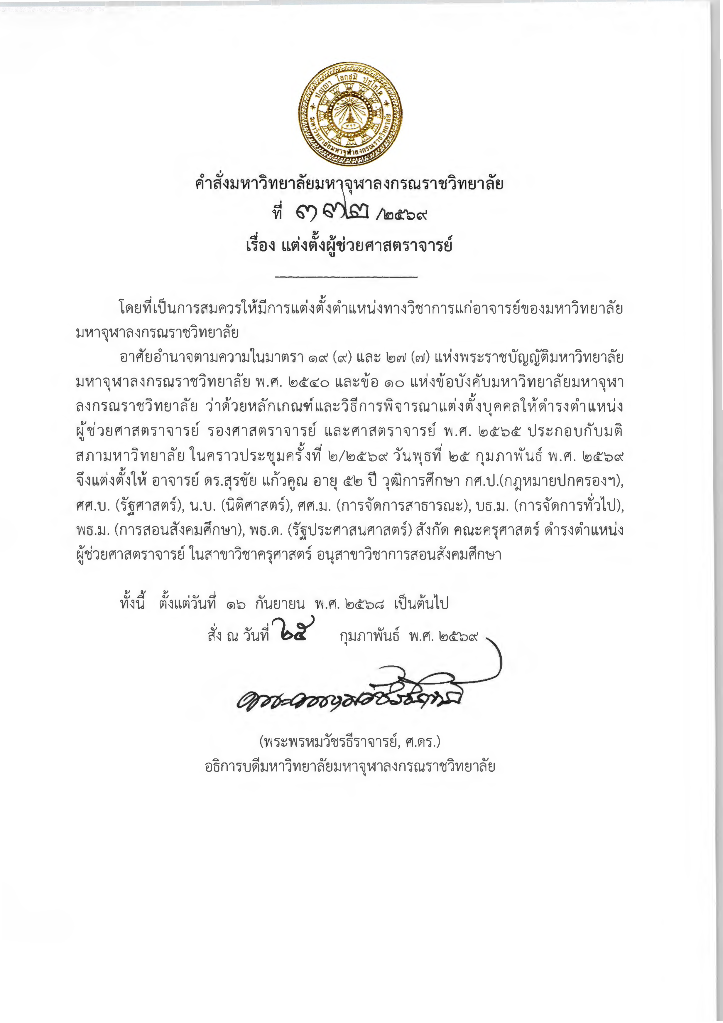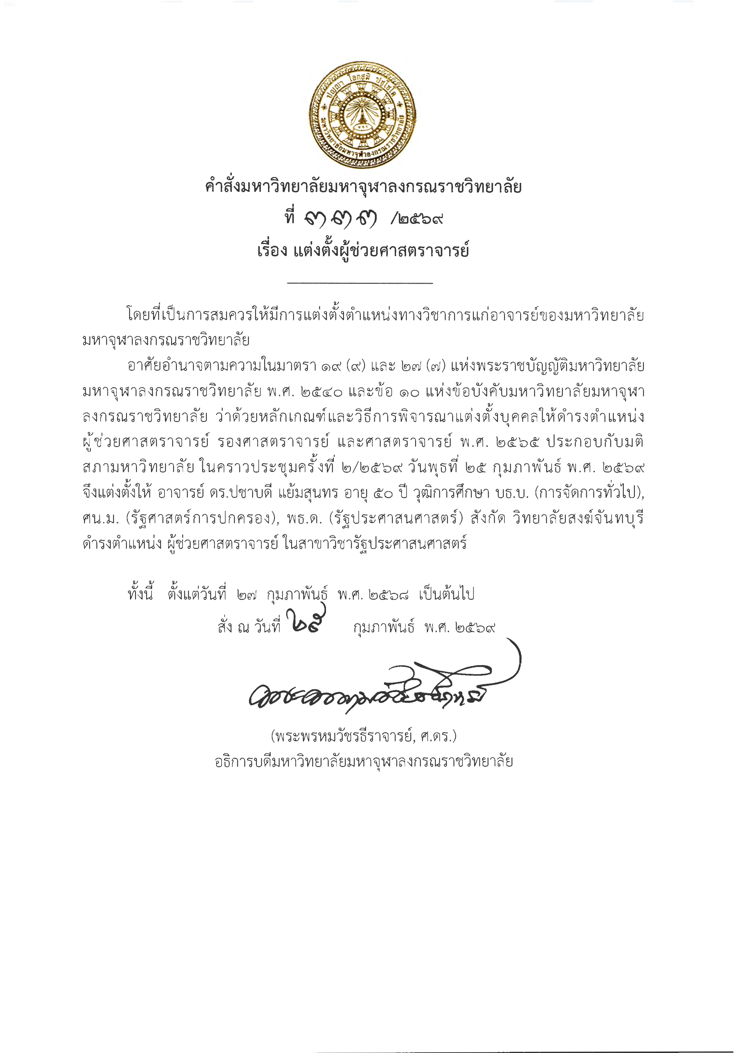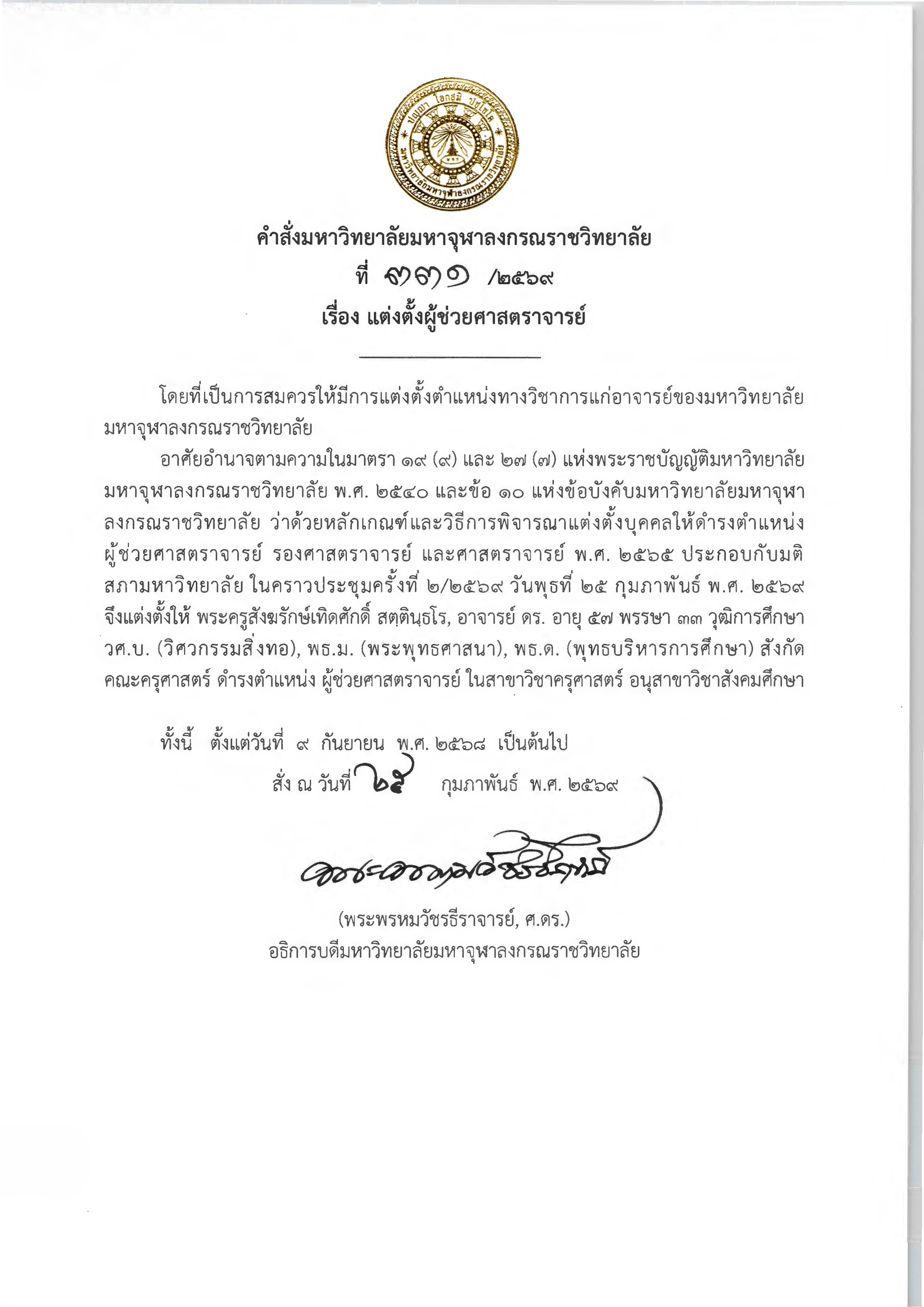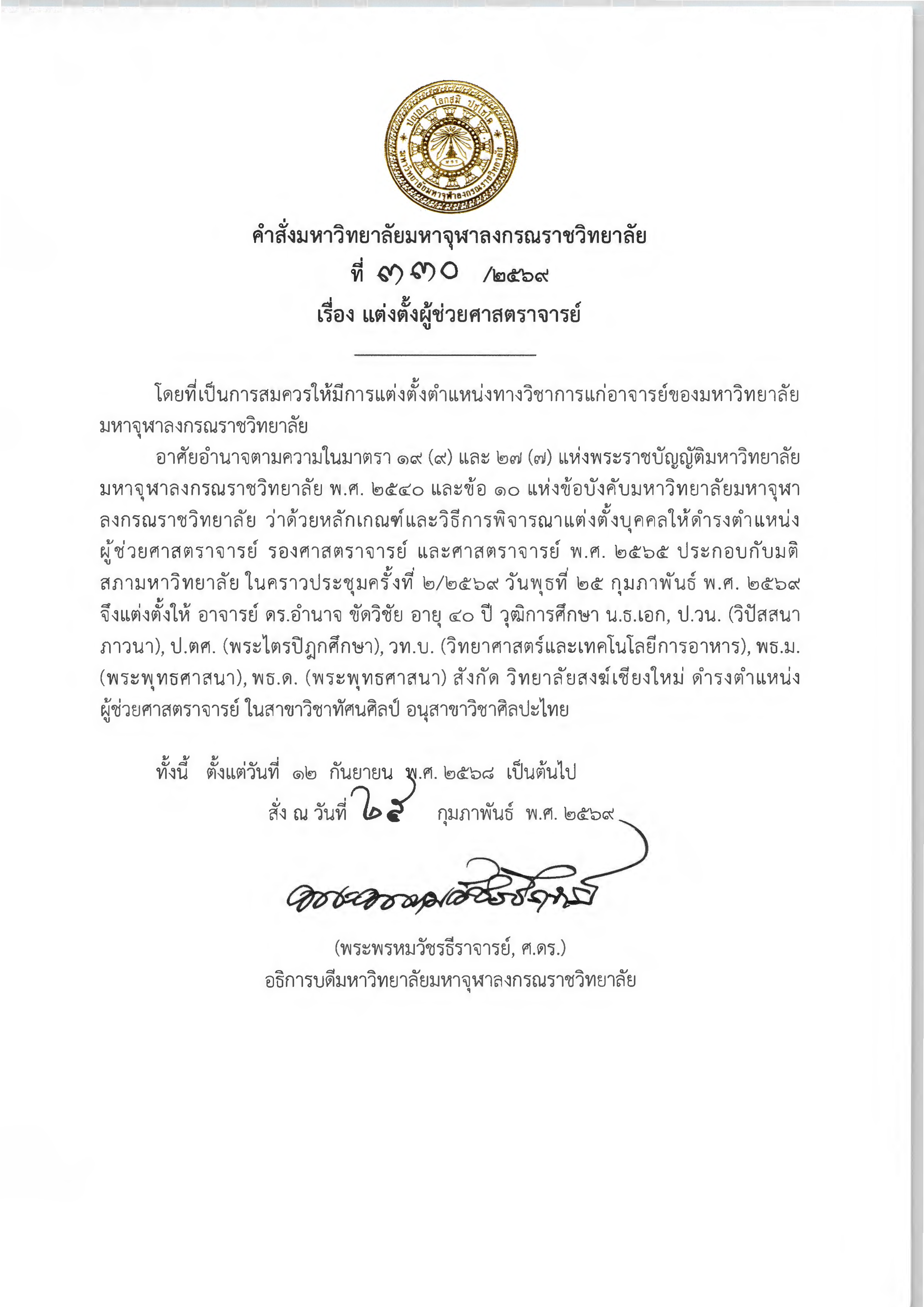 คำสั่งมหาวิทยาลัยมหาจุฬาลงกรณราชวิทยาลัย เรื่อง แต่งตั้งผู้ดำรงตำแหน่งทางวิชาการในตำแหน่ง “ผู้ช่วยศาสตราจารย์”