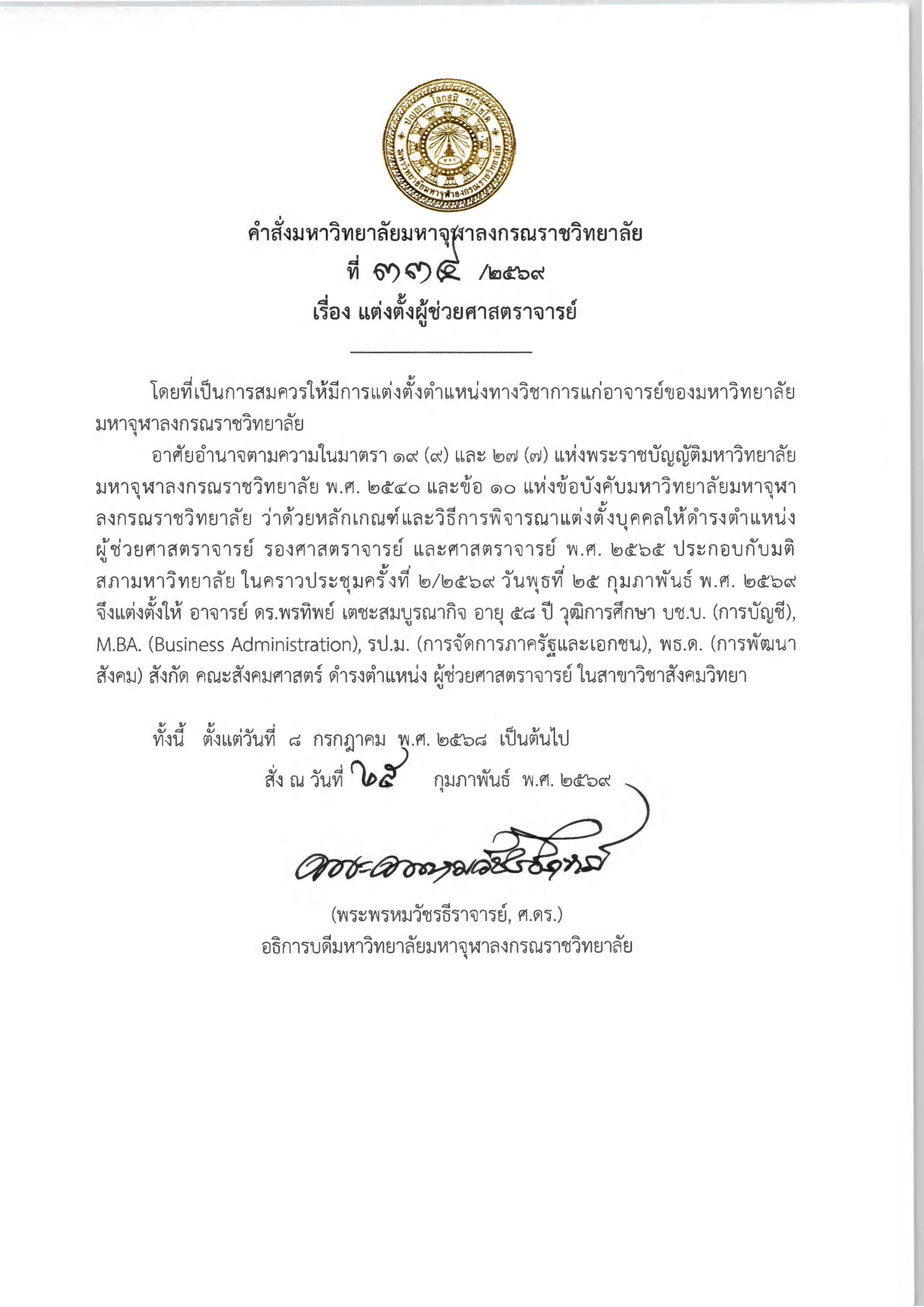 คำสั่งมหาวิทยาลัย เรื่อง แต่งตั้งผู้ดำรงตำแหน่งทางวิชาการในตำแหน่ง “ผู้ช่วยศาสตราจารย์”​