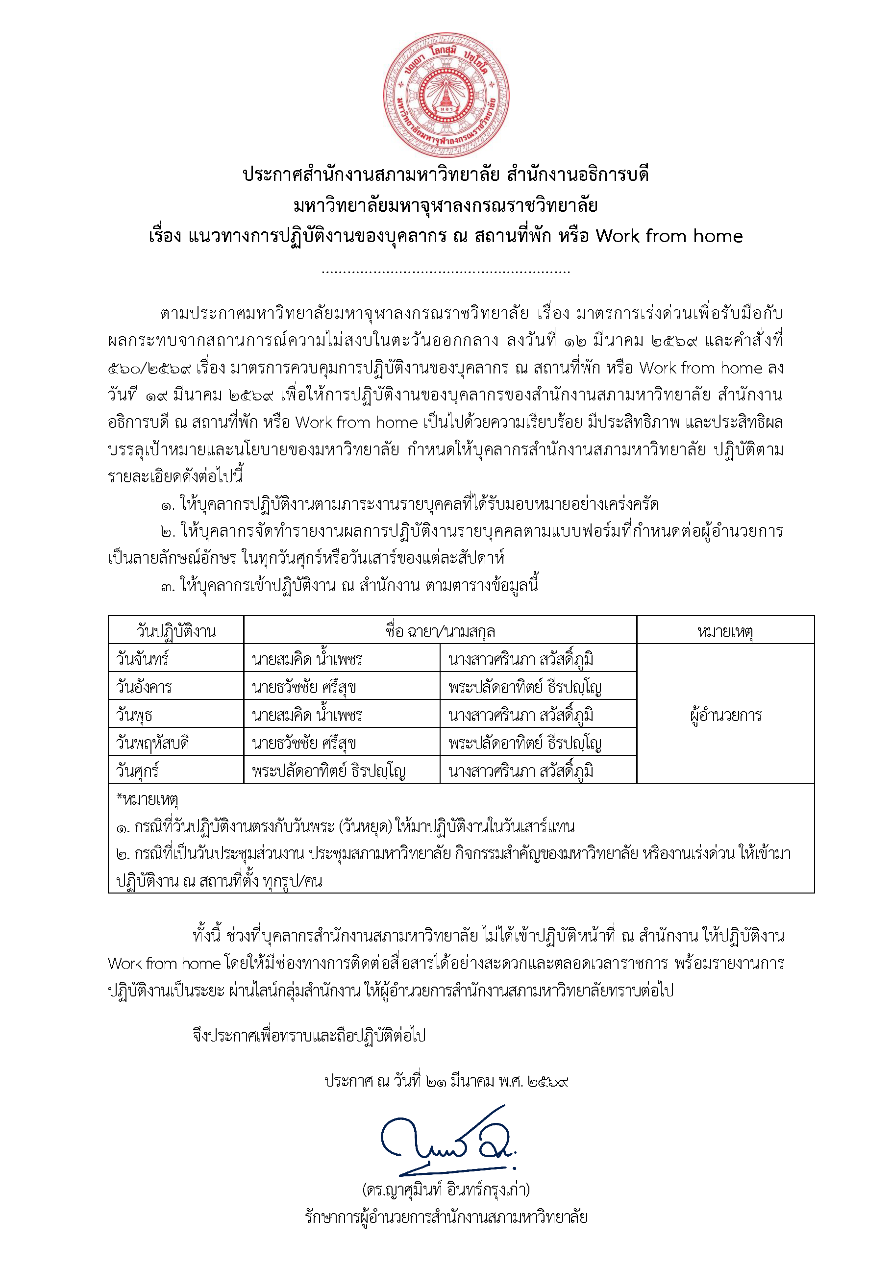 ประกาศสำนักงานสภามหาวิทยาลัย เรื่อง แนวทางการปฏิบัติงานของบุคลากร ณ สถานที่พัก หรือ Work from home